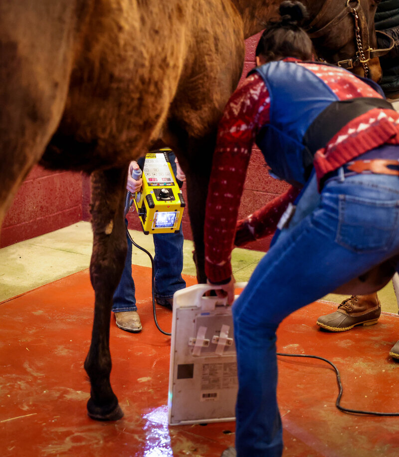 ESWT delivers focused high-energy acoustic waves to stimulate healing in bone, ligament, and tendon injuries. This non-invasive therapy is commonly used to promote healing of suspensory ligaments, proximal sesamoid injuries, and lumbar or pelvic soreness.